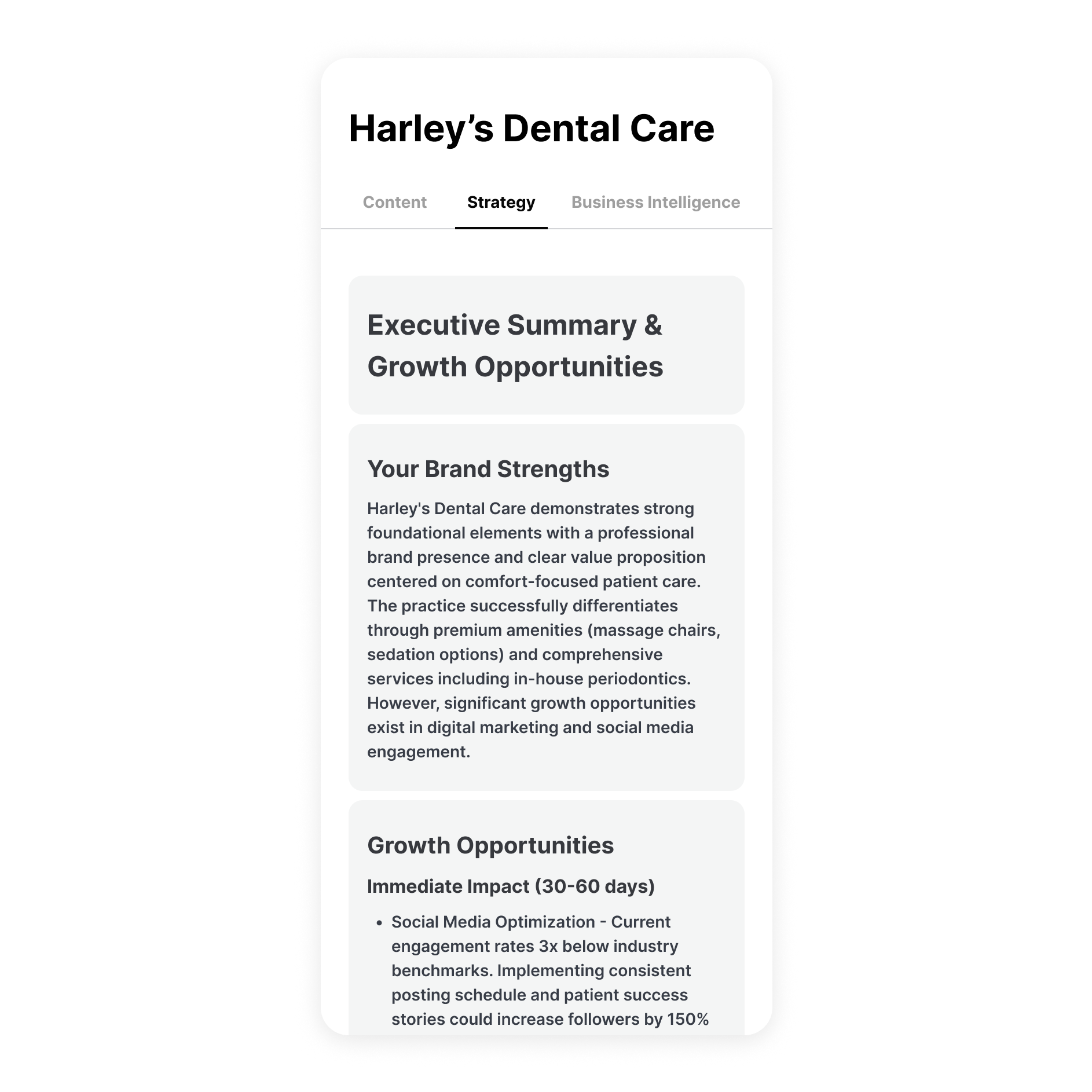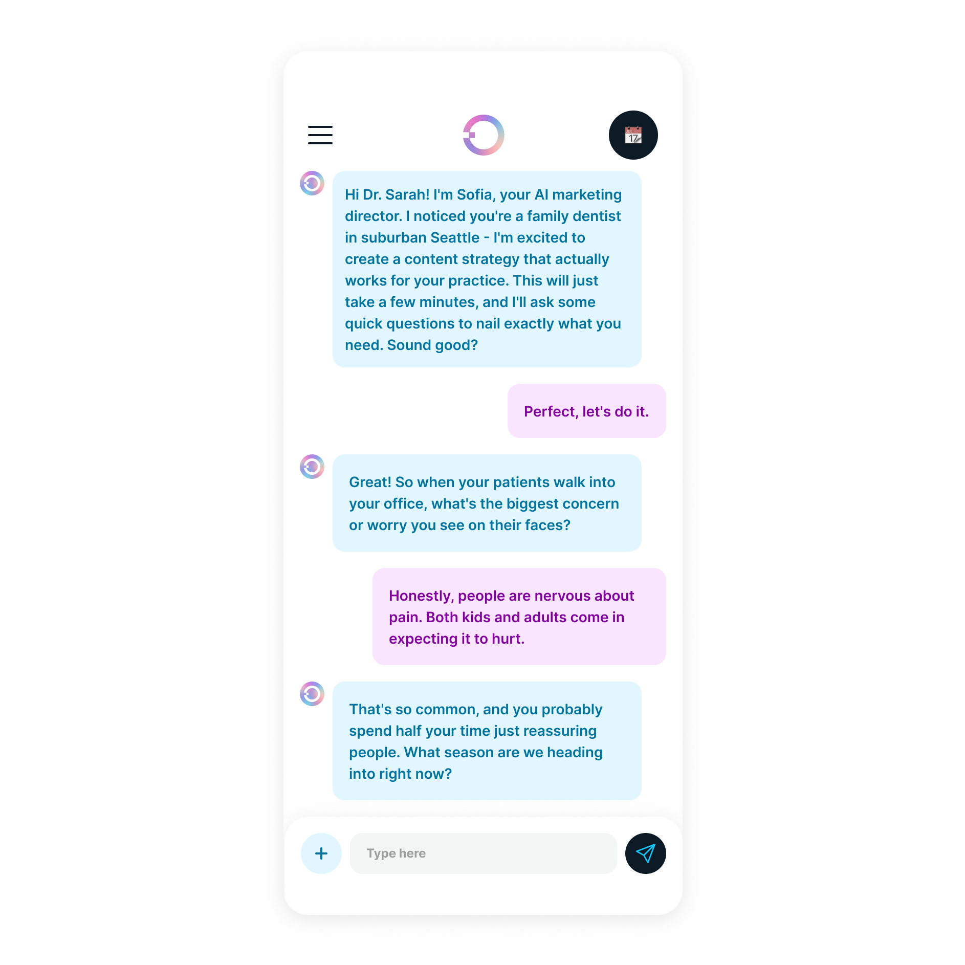 Just chat with your AI teammate about your practice goals. It researches dental competitors within miles of your location, builds your custom patient acquisition strategy, and creates authentic social content featuring you and your team - no photo or video shoots required